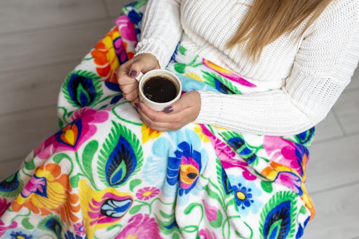 The blanket from Łowicz is the perfect companion for autumn evenings, winter sittings in front of the fireplace and summer picnics. It will be perfect in any situation and will add a touch of folk colors to it. Thanks to the beautiful folk pattern, the blanket will decorate your home and perfectly fit into any interior. Big fat and fluffy - it has everything you need. You can not only cover yourself with it, but also wrap yourself up and warm up properly.
