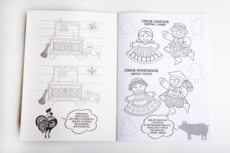 A folk colouring book with stickers is another product from the Folk Story series, which takes children on a journey through the most beautiful regions of Poland, famous for their traditions and folk art. Folk colouring book is a notebook full of coloring pages and puzzles for smaller and older children. Color the folk costumes, find 10 differences in the Lowicz cottage and help Janek reach the well ;) Paint, circle, stick - have more fun than at the fair ;)