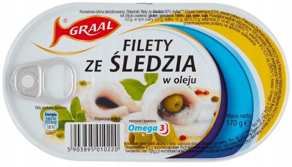 Herring fillets in oil by Graal are one of the most frequently purchased canned fish products in Poland. An excellent combination of high-quality, delicate herring fillets and aromatic oil. A great snack for any time of the day.
